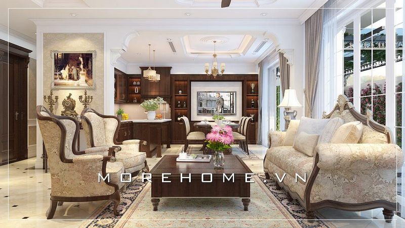 Phong cách tân cổ điển đã được sử dụng để trang trí đồ nội thất trong không gian phòng khách biệt thự, nhà phố, tạo ra một vẻ đẹp độc đáo.