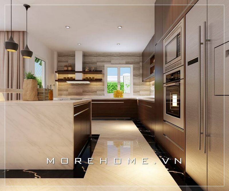 Nội thất phòng bếp của nhà biệt thự được thiết kế hiện đại, trẻ trung và tiện lợi.