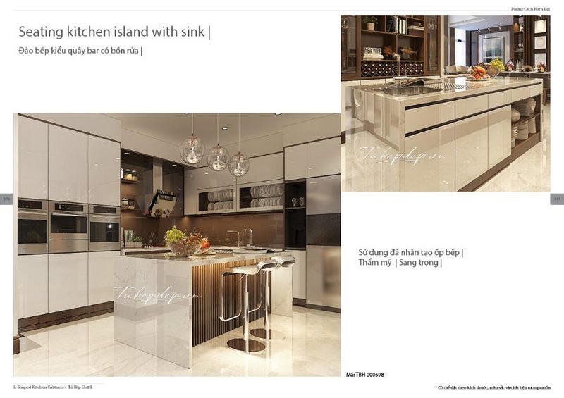 Tủ bếp gỗ công nghiệp acrylic đồng màu và đá ốp cao cấp được sử dụng để thiết kế nội thất phòng bếp hiện đại và sang trọng.