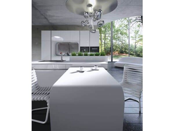 Bàn ăn mặt đá nhân tạo màu trắng với đường cong mềm mại lợi thế đặc biệt của đá nhân tạo mang tới giá trị sử dụng, thẩm mỹ cao.