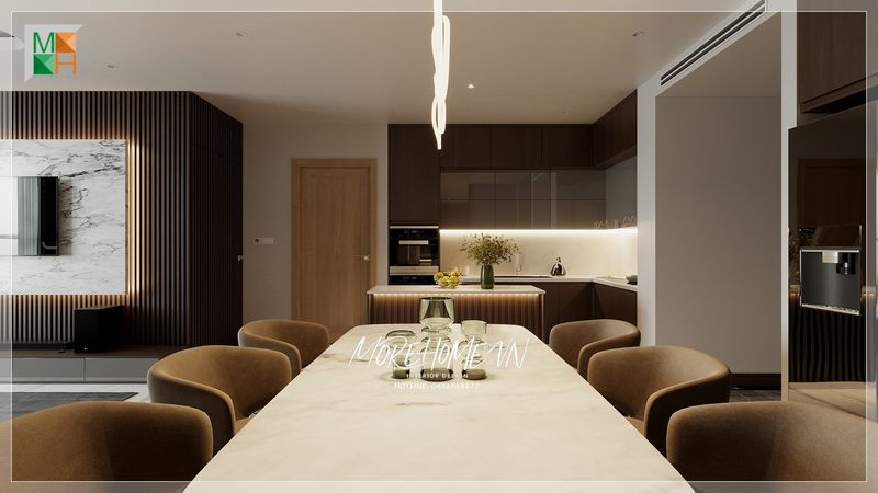 Thiết kế nội thất phòng bếp trong căn hộ hiện đại, đơn giản và thuận tiện.